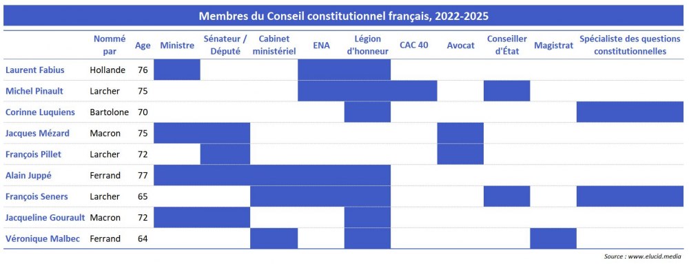 Concluons cette partie par la synthèse des membres actuels du Conseil constitutionnel, qui est éloquente.