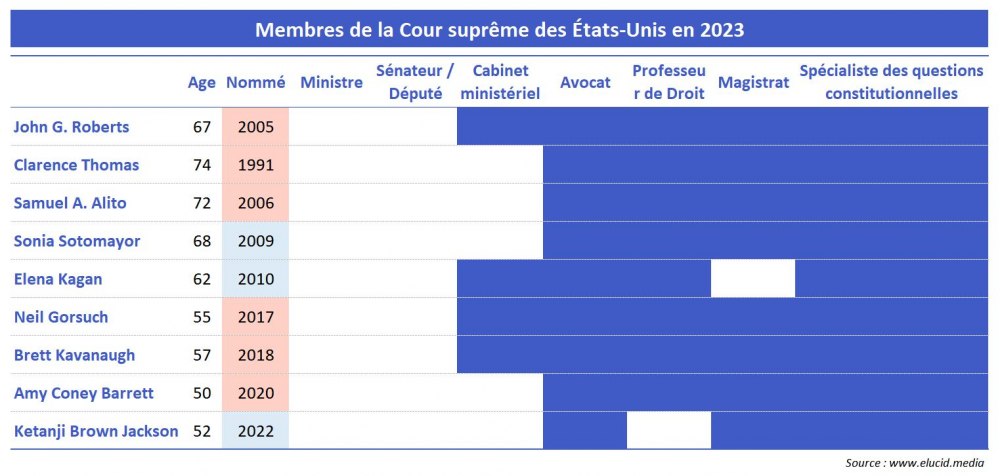 L’analyse détaillée des membres montre que la Cour comporte les plus grands juges et juristes américains, spécialisés dans sur questions constitutionnelles. L’influence politique est nulle : si les juges sont politisés, aucun n’est une personnalité politique qui aurait été élue.