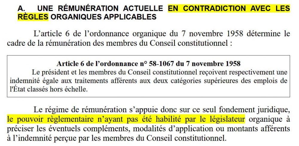 « Le Conseil constitutionnel ne peut pas être dans l’inconstitutionnalité. […] Ils le savent depuis longtemps et ils n’ont pas réagi ». En effet, « Le Conseil constitutionnel n’aurait en fait jamais accepté la rémunération fixée en 1958. […] Depuis 1958, les membres du Conseil constitutionnel cherchent donc par tous les moyens à s’augmenter. »