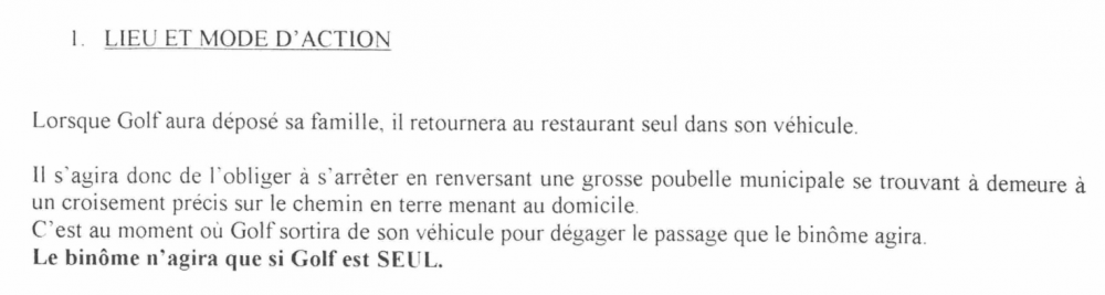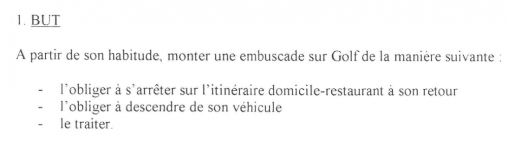 « Le sous-chef [NdR. Gilbert Borelli], a continué : [...] On va monter d'un cran dans le dossier Golf Pierre [...] Le chef [NdR. Gilles Kaehlin] veut qu'on trouve un moyen d'emmerder Golf. [...] On pourrait le piéger. On peut monter une affaire de drogue, du genre placer de la dope dans son scooter ou ailleurs, ou encore on monte une histoire de cul..." Je l'ai interrompu pour lui demander quelle histoire de cul, vu que notre client avait l'air plutôt à l'aise de ce côté-là. Il a continué : "On trouve une fille, une professionnelle qu'on lui colle entre les pattes. Une fois que Golf l'a sautée, la fille va porter plainte pour viol. Dans tous les cas de figure, on planque au sortir du commissariat, avec des appareils photo" [...] Faudra pas oublier de prévenir la presse [...] Le chef a dit qu'il fallait le discréditer médiatiquement. [...] On prend une décision ce week-end. »