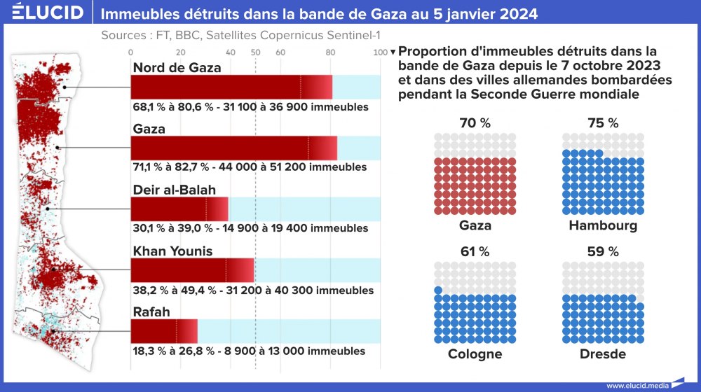 Ce lourd bilan est peu surprenant quand on sait que 70 % des immeubles ont été détruits dans la petite zone urbaine qu’est Gaza, ce qui en dit long sur l’intensité des bombardements.