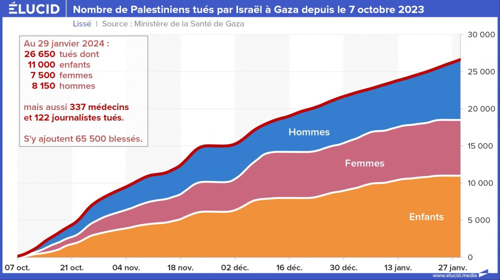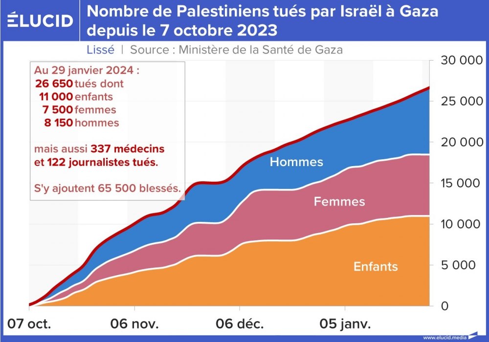 On parle beaucoup depuis trois mois, à raison, du bilan effroyable des bombardements indiscriminés, qui approche les 30 000 morts et 70 000 blessés, soit respectivement 1,4 % et 3 % de la population palestinienne.