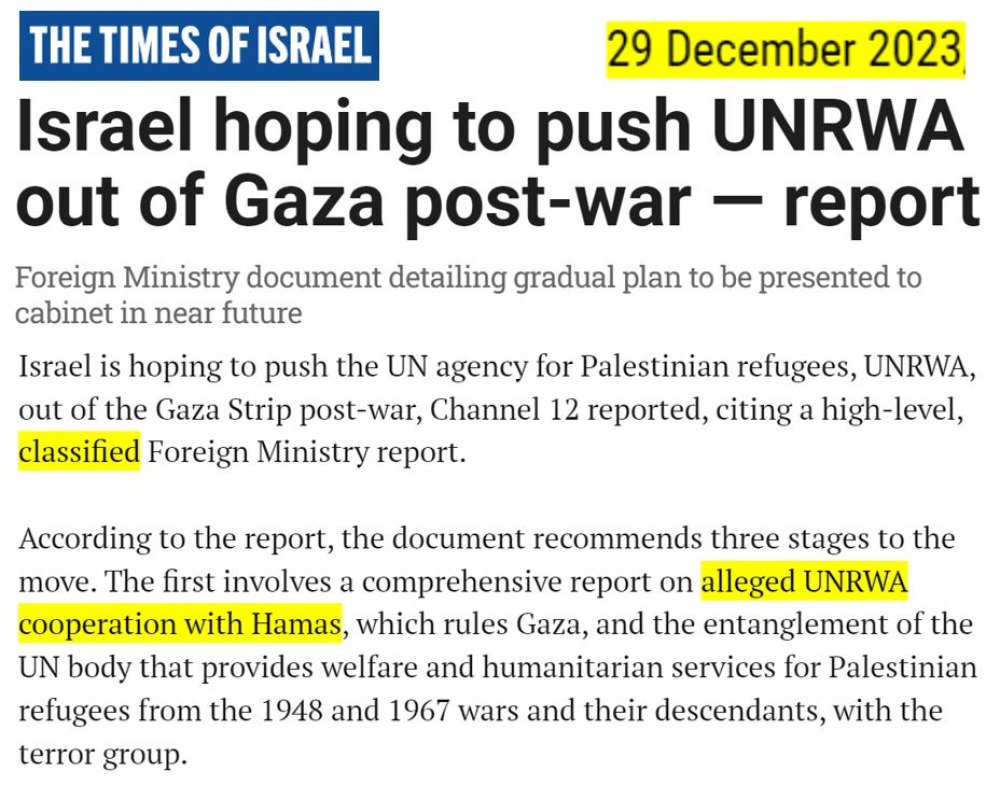 Ces actions « choquantes » de l’Occident correspondent d’ailleurs à la première étape du plan de liquidation de l'UNRWA (révélé en décembre) élaboré par le ministre israélien des Affaires étrangères, qui n'apprécie guère que l'organisation documente les exactions de l'armée israélienne.