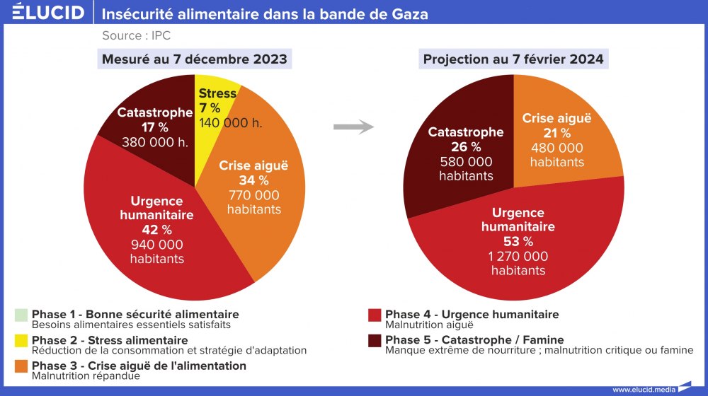 Dans sa dernière étude, elle estime que plus de la moitié des Gazaouis, soit 1,2 million de personnes, sont en urgence alimentaire (IPC 4), et que 580 000 Gazaouis sont en situation de catastrophe alimentaire (IPC 5), très proche de la famine.