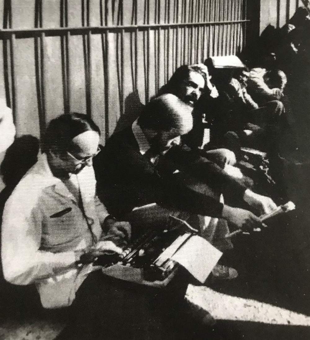 Jonathan Randal (à gauche) devant l’ambassade américaine à Téhéran, le lendemain de la prise d’otages, novembre 1979.