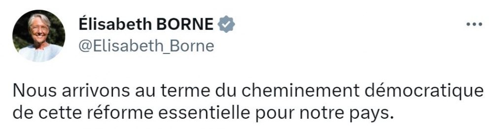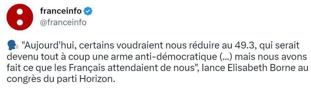 Ceci n’empêche pas la Première ministre de déclarer qu’elle a seulement fait « ce que les Français attendaient » d’elle, et que le 49-3 (donc adopter une loi sans vote du Parlement) n'est pas antidémocratique... tout cela est vertigineux.