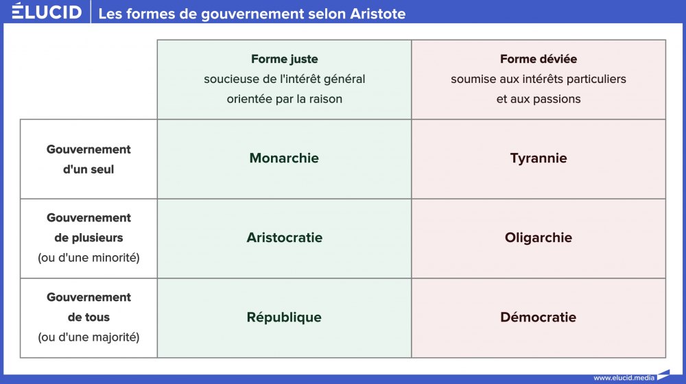 Aristote a proposé il y a 2 500 ans une classification des différents types de gouvernement. Il combine pour cela deux critères : d'une part le nombre de souverains, de l'autre la finalité du gouvernement, c’est-à-dire si celui-ci œuvre au bénéfice du bien commun (forme correcte, la plus juste) ou à celui des dirigeants (forme dégénérée). On distingue ainsi :