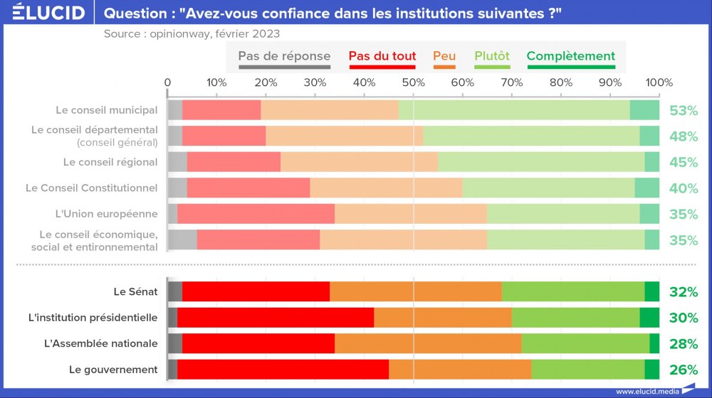 Les Français perçoivent pourtant bien le problème, sans toujours mettre les bons mots dessus. Si 95 % plébiscitent la démocratie en général, moins de 40 % d’entre eux estiment qu’ils sont gouvernés démocratiquement, et moins de 20 % sont satisfaits de leurs institutions.