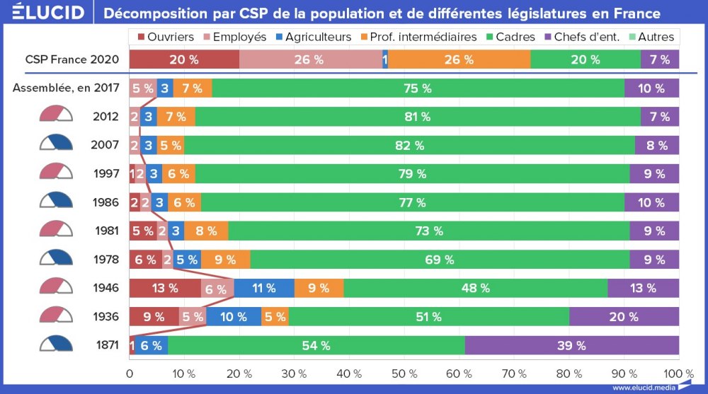 On constate bien que c’est toujours le cas aujourd’hui : les candidats sont en majorité issus des classes les plus favorisées, et sont élus ceux qui auront été le plus distingués, notamment avec le concours de l’appareil médiatique.