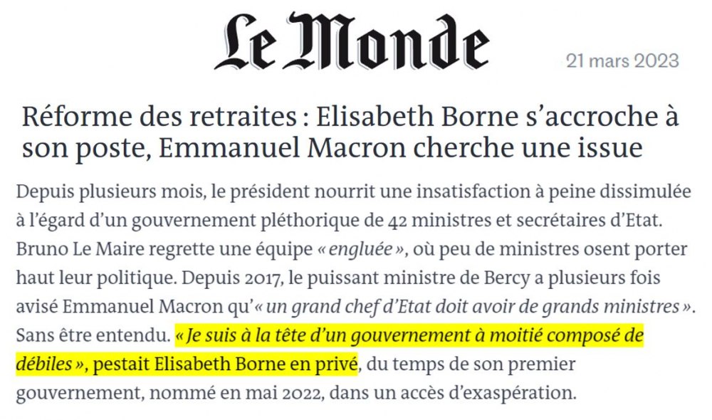 La Première ministre Élisabeth Borne a montré la voie du grand n’importe quoi, notamment au moment de son n-ième 49-3, lorsqu'elle a parlé du « cheminement démocratique » de la réforme des retraites pourtant non votée à l'Assemblée.