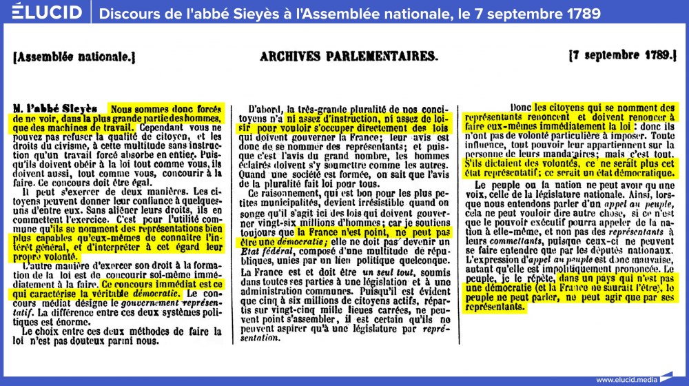 « Le choix entre ces deux méthodes de faire la loi n'est pas douteux parmi nous. D'abord, la très grande pluralité de nos concitoyens n'a ni assez d'instruction ni assez de loisirs pour vouloir s'occuper directement des lois qui doivent gouverner la France ; leur avis est donc de se nommer des représentants. […]
