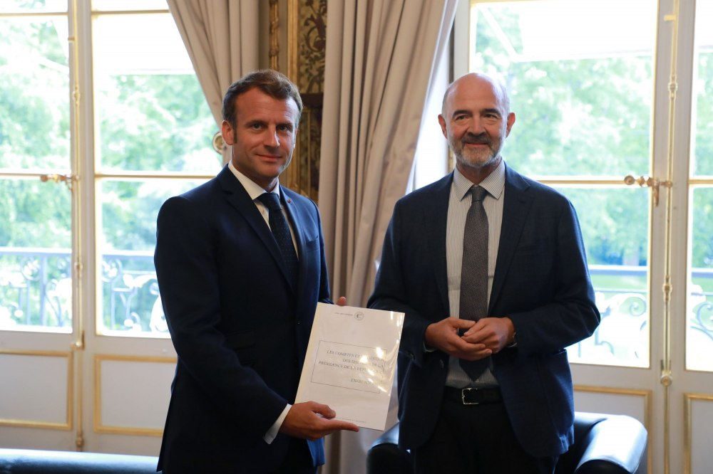 E. Macron reçoit le Rapport annuel de la Cour des Comptes par P. Moscovici, Paris, 28 juillet 2020 - - @AFP