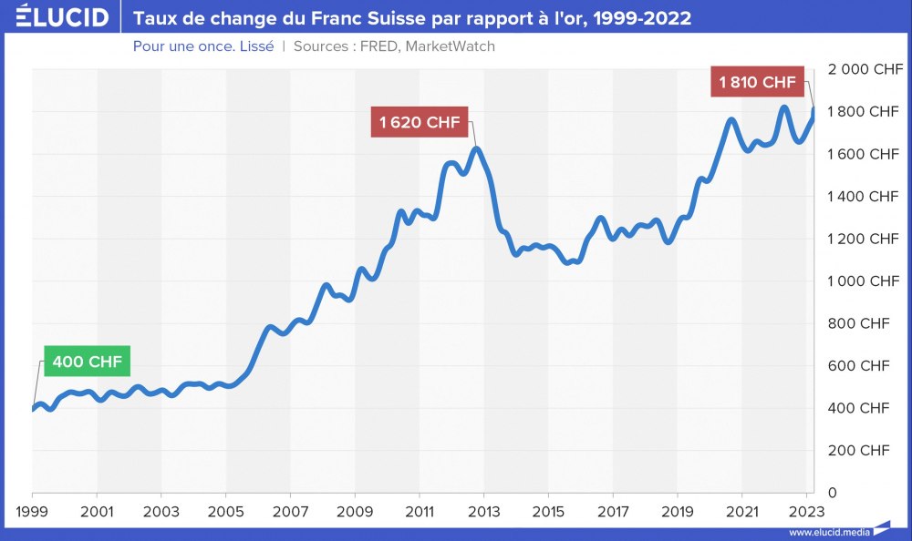 Lorsque l'on observe le cours de l’or en francs suisses, on remarque que, sur 20 ans, le franc a perdu plus de 3,5 fois sa valeur contre l’or. Cette dévaluation est subie par l’épargnant et le salarié en francs suisses, qui la paient par leur perte de pouvoir d’achat.