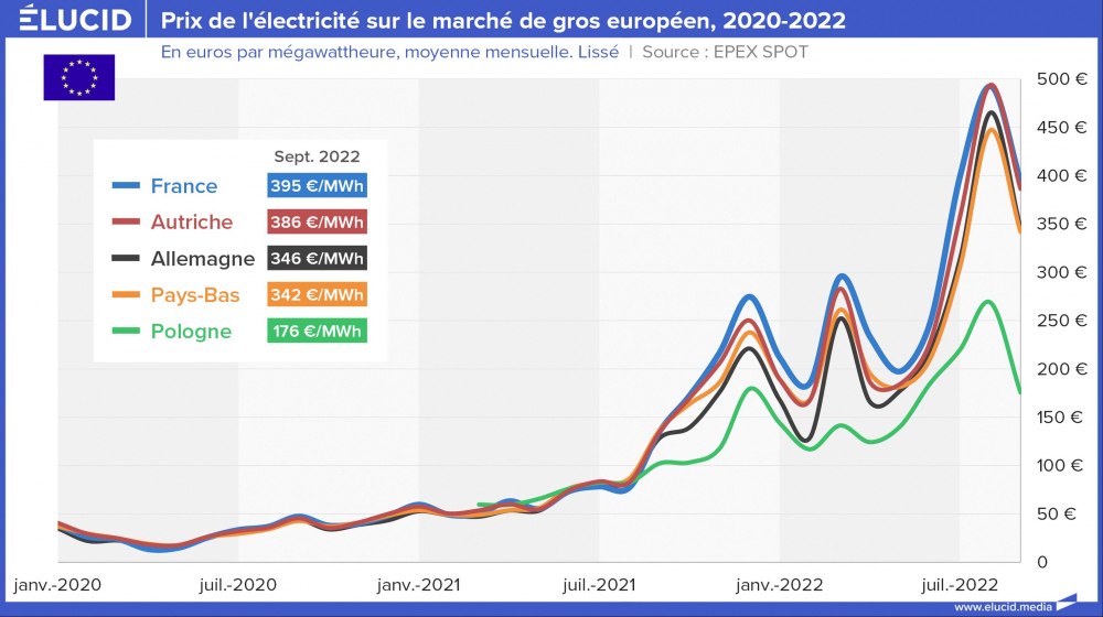 Dans l'Hexagone, ils se négocient au prix délirant de 800 euros le MWh pour la période octobre-décembre 2022 et tutoient les 1500 euros pour les heures de pointe. Soit deux à trois fois plus cher que dans les pays voisins. Les craintes de pénuries cet hiver en France sont particulièrement élevées alors que le parc nucléaire traverse une période d’indisponibilité historique, avec 27 des 56 réacteurs du territoire à l’arrêt pendant l'été, pour maintenances et contrôles.