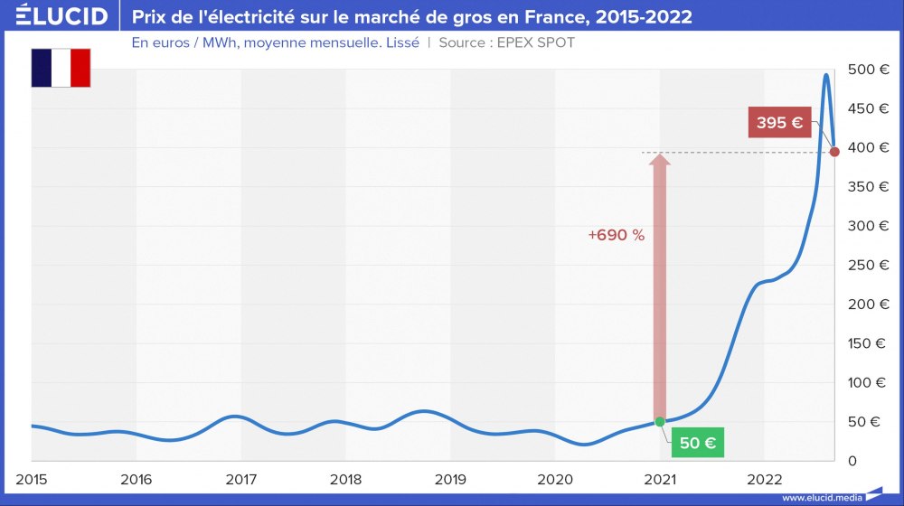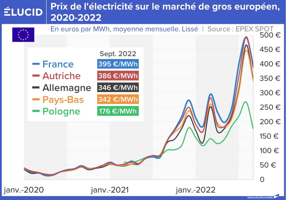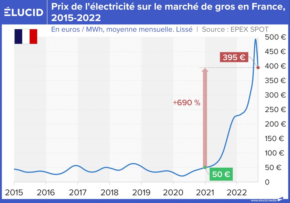 En février 2022, l’invasion russe en Ukraine a fait bondir les prix à plus de 300 euros le MWh dès mars. Et depuis le printemps, la faiblesse des vents et la sécheresse inédite qui touche l’Europe (augmentant encore la demande en électricité) sont venues alimenter la pression sur les prix, qui ont tutoyé les 500 euros le MWh en moyenne en août 2022, avec un pic français à plus de 1000 € le mardi 30 août.