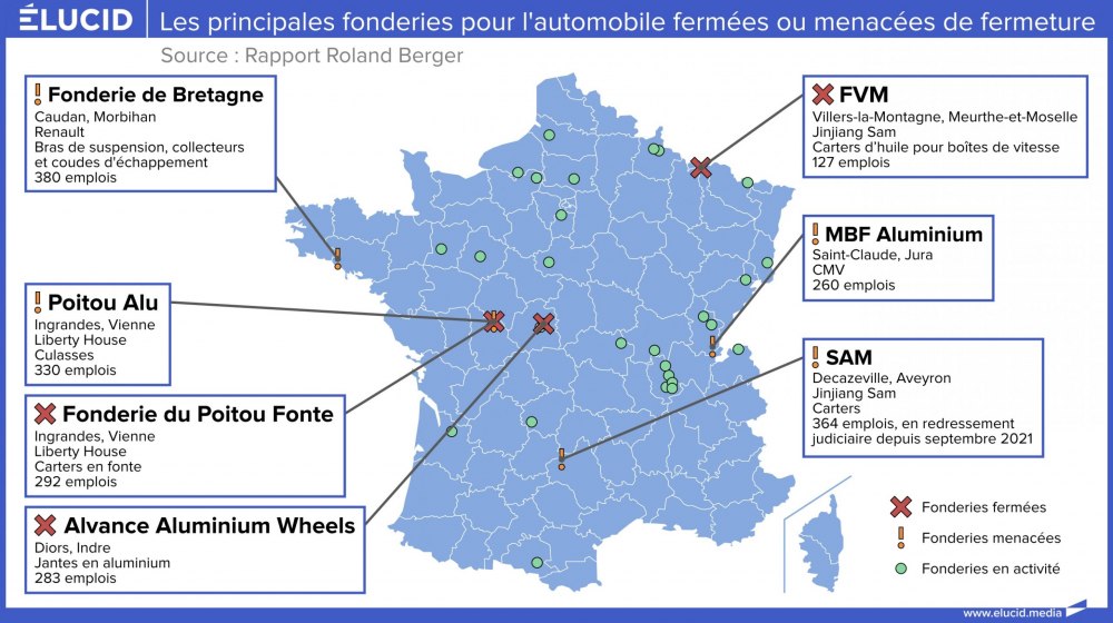 En Meurthe-et-Moselle, la fonderie FVM a été placée en liquidation en avril 2021. Son propriétaire chinois Jinjiang depuis 2017 avait promis d’investir 20 millions d’euros. Ils ne sont jamais arrivés. Dans l’Aveyron, la fonderie Sam, en liquidation judiciaire depuis septembre 2021, a finalement fermé ses portes lundi 29 novembre, laissant 350 salariés sans emploi. Dans la Vienne, le site « fonte » des Fonderies du Poitou est liquidé depuis juillet dernier, tandis que le site « alu » est en redressement depuis avril.