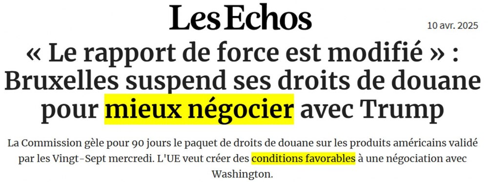 Plus de 70 gouvernements ont envoyé des émissaires dans le but explicite de conclure des accords qui leur seront défavorables, mais moins que les droits de douane initialement annoncés. L’Union européenne a ainsi mis en pause ses propres mesures de rétorsion « pour créer des conditions favorables » avec Trump (ne pas répondre à l’agression violente ou le faire – l'avenir nous dira donc qui de l’UE ou de la Chine a eu la meilleure stratégie face à la brutalité américaine).