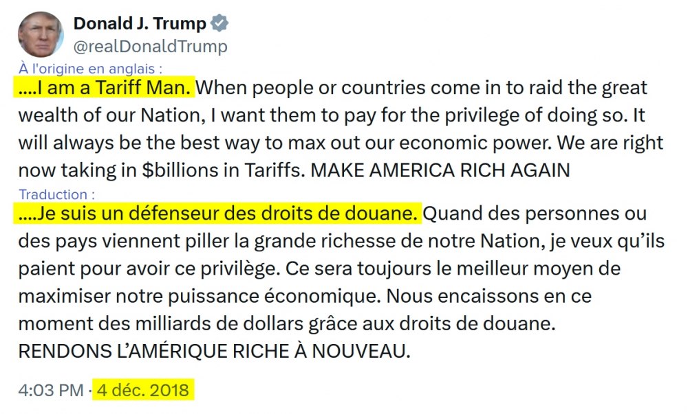 Au final, le New York Times a très clairement résumé il y a un an et demi le programme de Trump dans un article intitulé : « Une nouvelle taxe sur les importations et une scission avec la Chine : le programme commercial de Trump pour 2025 ».