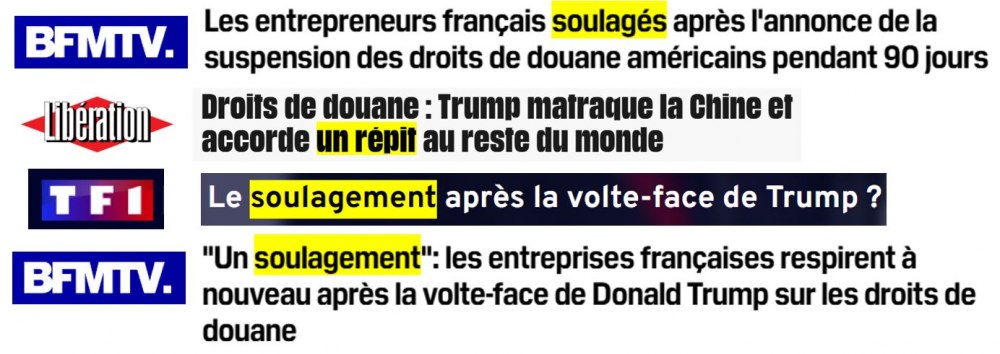 Cela signifie qu’en cette mi-avril, les produits français entrant aux États-Unis coûtent 15 % plus cher que le 1er avril, et les produits américains en France coûtent 5 % moins cher. Il est vraiment rageant que nous ayons un président français trop intelligent et sensé pour arriver à ce genre de résultats économiques !