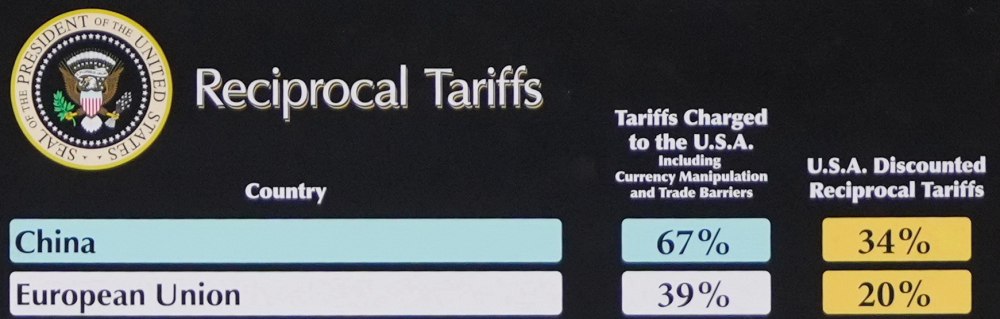 Mais en revanche, Trump a surpris tout le monde en annonçant qu’en outre, à compter du 9 avril, quatre jours plus tard seulement, ces droits augmenteraient très fortement pour tous les pays qui génèrent un déficit commercial pour les États-Unis (c’est-à-dire la vaste majorité des pays), pour atteindre une valeur de 11 % à 50 %, dont 20 % pour l’UE, 46 % pour le Vietnam et 34 % pour la Chine qui s’ajoutent aux 20 % imposés peu de temps avant (soit un total de 54 %, s’ajoutant au taux moyen d’environ 15 % déjà en application en 2024).