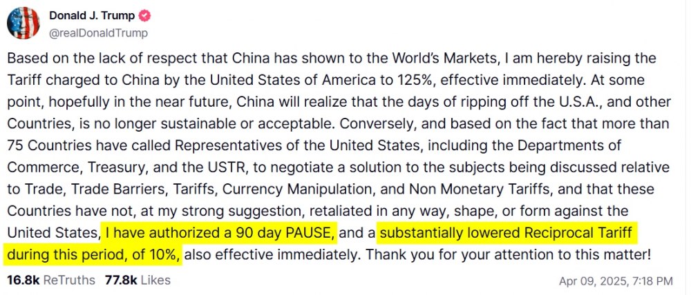 En revanche, il y avait un point fondamental à voir, c’est que la « pause », mot qu’a martelé Trump dans sa communication, ne concernait que la surtaxation individualisée par pays, et non pas la taxation de base de 10 % pour tous les pays.