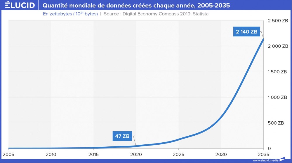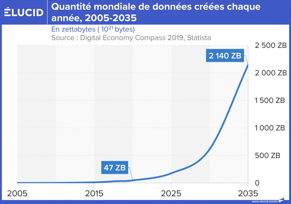 Une projection de l’institut Statista dans son Digital Economy Compass de 2019 estimait à 33 zettaoctets la production de données à l’échelle mondiale pour 2018 (1 zettaoctet représente 1021 octets, soit 1 000 milliards de gigaoctets). Dès 2025, on arriverait à 175 zettaoctets, soit cinq fois plus. Si la tendance se poursuivait, on atteindrait plus de 2 000 zettaoctets en 2035, c’est-à-dire une multiplication par quarante-cinq en l'espace de 17 ans.