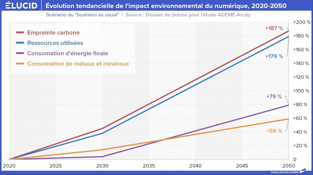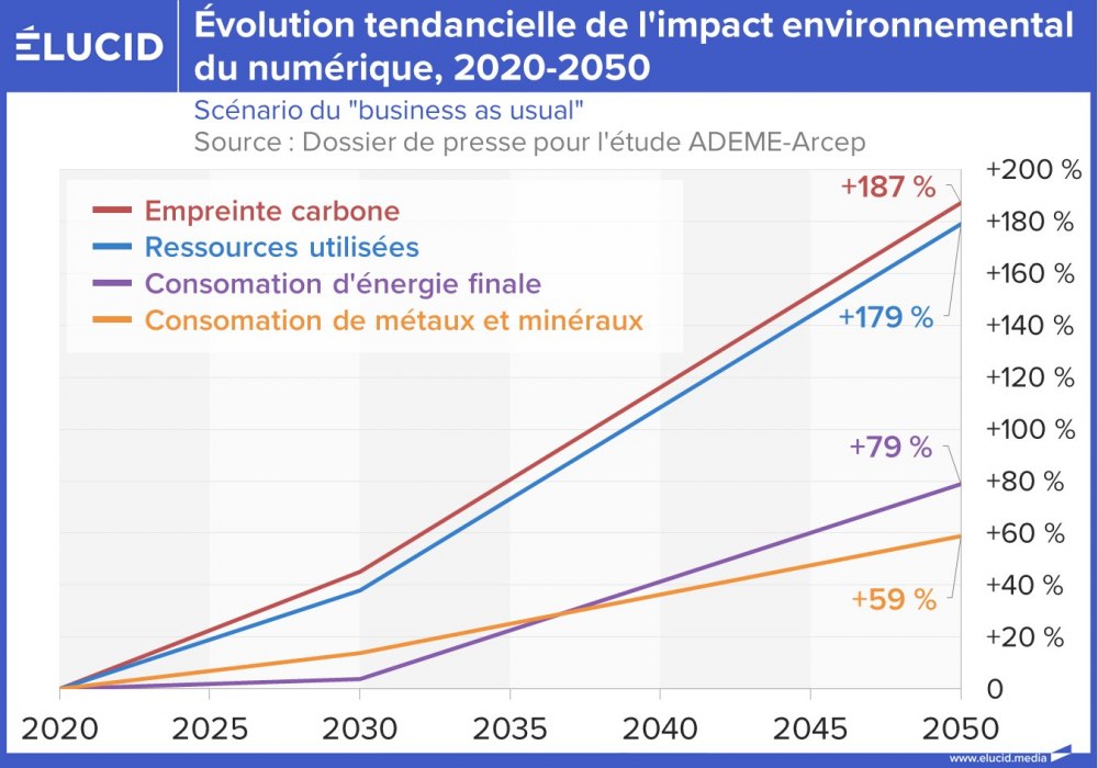 Pour donner une idée de ces perspectives, l’agence de la transition écologique ADEME et l’Arcep ont publié en mars 2023 une étude sur les effets environnementaux du numérique. Ciblée sur la France uniquement, elle corrobore ces projections, estimant que, sans changement majeur, l’empreinte carbone du secteur augmenterait de 45 % d’ici 2030.