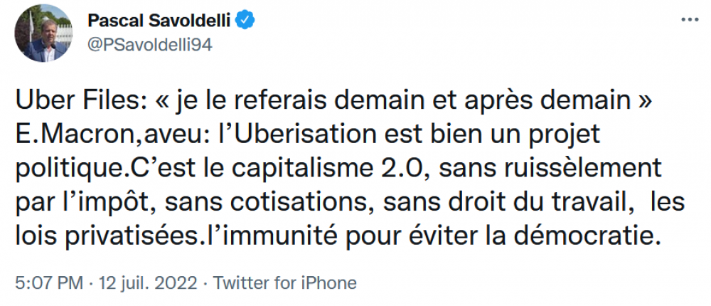 Les Uber Files laissent deviner en coulisse les relations privilégiées entre Emmanuel Macron et Uber, la plateforme du numérique qui incarne jusqu'à la caricature la casse du travail. La politique de l'un et de l'autre vont main dans la main, et ne pourraient s'envisager sans leur concours réciproque : tout cela au détriment des travailleurs, des consommateurs et de l'Union européenne.