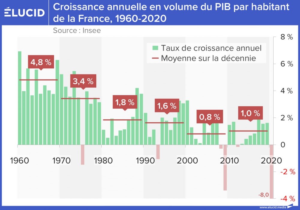 Quatrième acquis, en forme d’explication globale : si les aides publiques aux entreprises ratent leur cible, pourquoi ne sont-elles jamais remises en cause, pourquoi sont-elles même régulièrement augmentées ? La réponse à ce mystère tient dans la nécessité de limiter les effets destructeurs du « régime dépressionnaire » dans lequel la France évolue depuis près de quarante ans. Quatre décennies d’une croissance structurellement faible — qui va même en s’affaissant —, et contre laquelle il est impossible de lutter, à cadre constant, autrement qu’en organisant un soutien pérenne de la trésorerie des entreprises par la puissance publique.