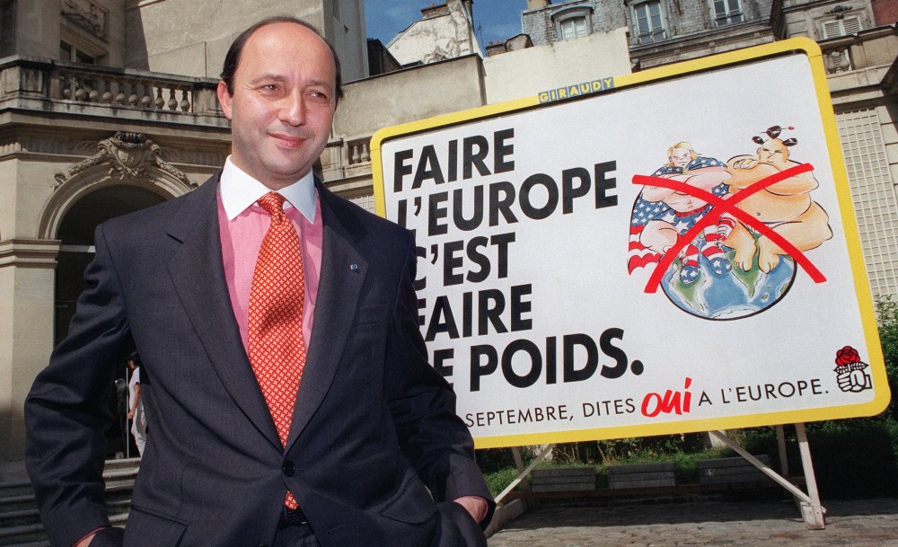 Laurent Fabius, premier secrétaire du Parti Socialiste, présente une affiche de campagne pour le "oui" au référendum sur le traité de Maastricht, Paris, 27 juillet 1992 - Franck Fife - @AFP